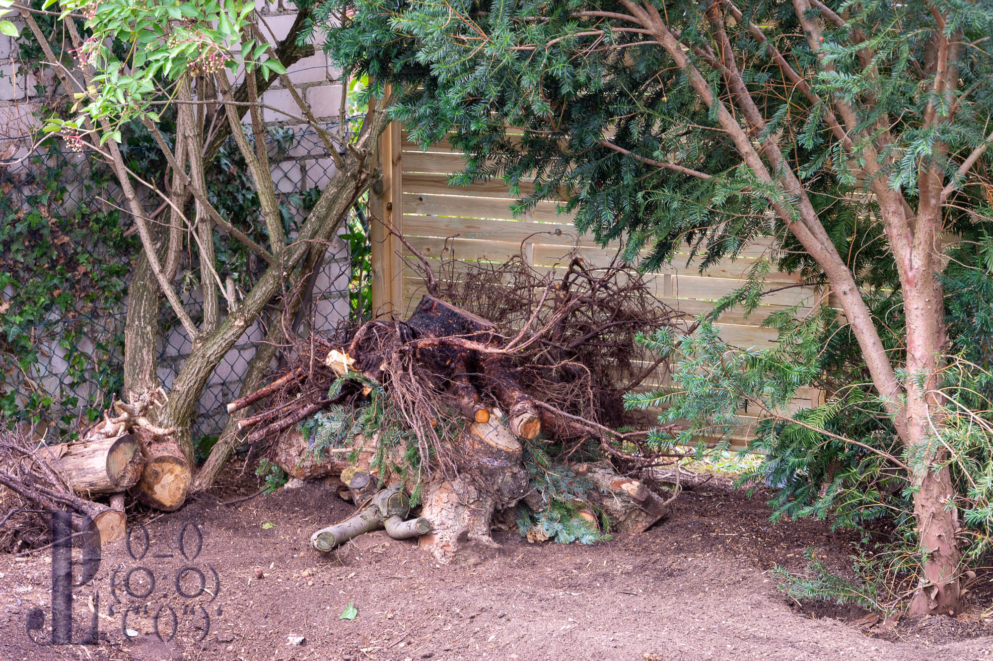 Fast neben dem ersten Igelbau entsteht ein zweiter. Zwischen der Eibe und dem schwarzen Holunder, im Schutz beider Büsche entsteht auf ähnlicher Art noch eine Igel-Unterkunft.